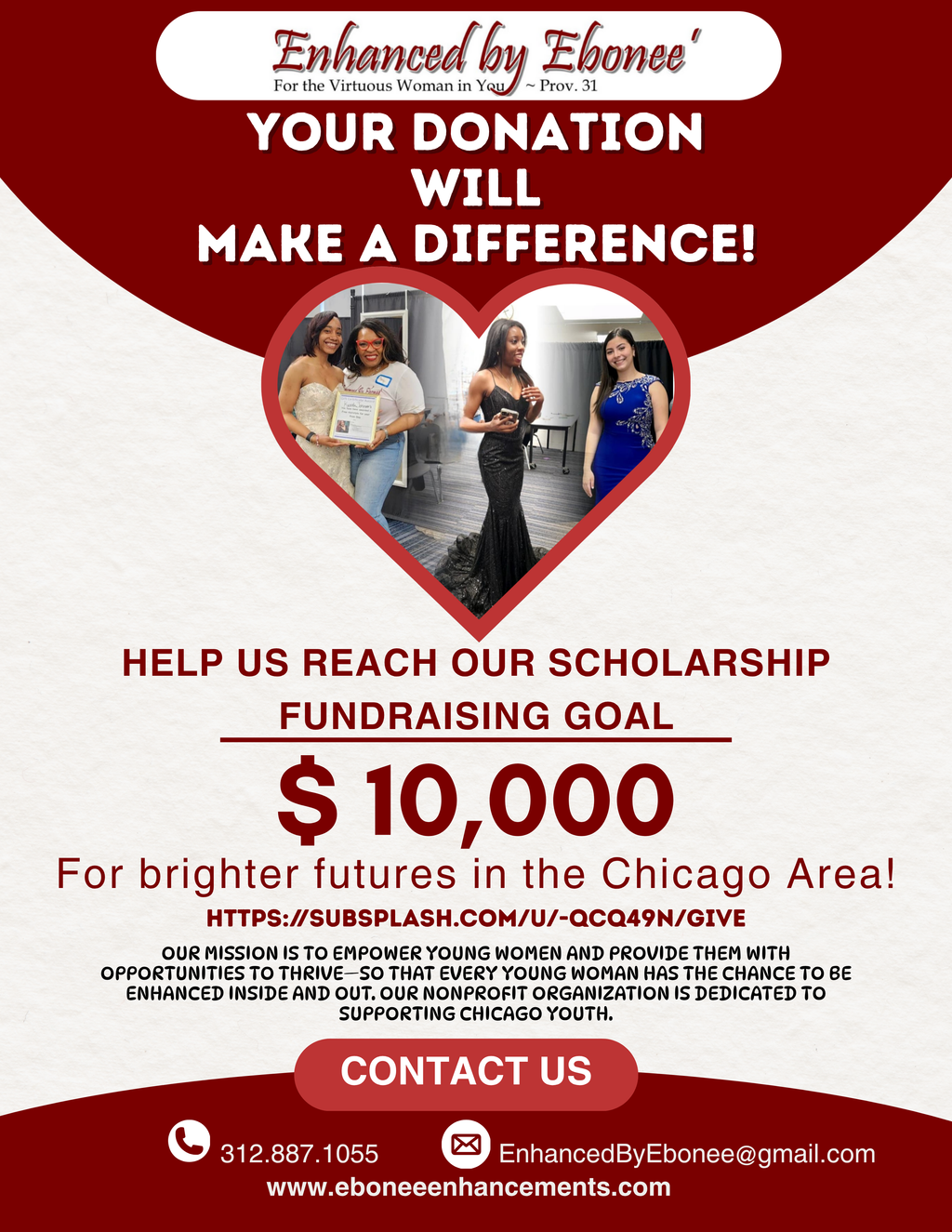 In 2024, I launched Enhanced by Eboneé, NFP, a nonprofit dedicated to empowering youth from low-income families in the Chicago area. We provide prom dresses, suits, accessories, and now, scholarships to help students reach their next level—college or trade school.